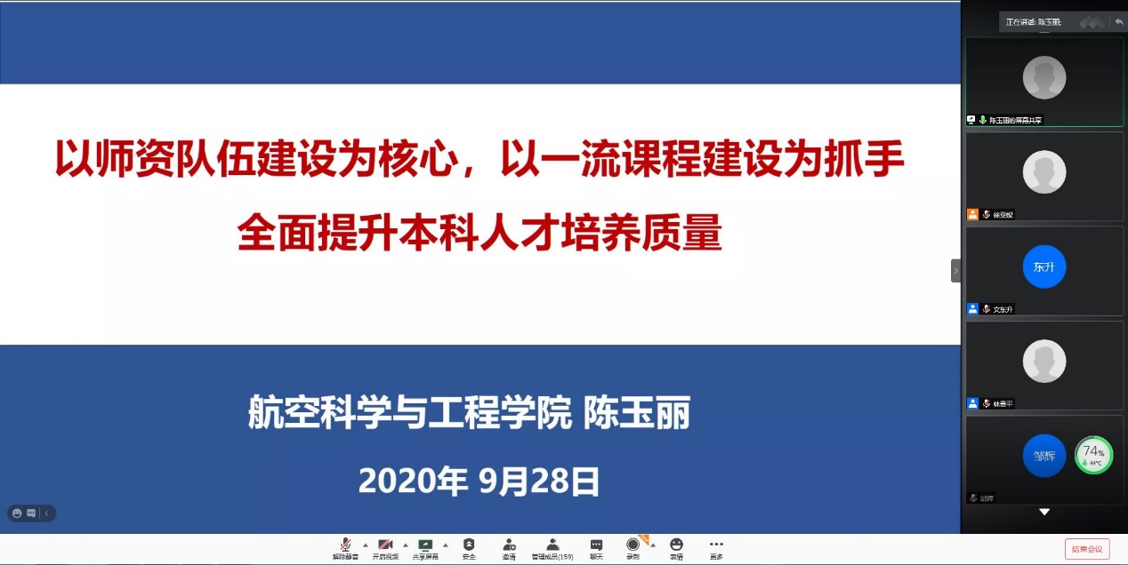 副院长陈玉丽做了题为《以师资队伍建设为核心,以一流课程建设为抓手 全面提升本科人才培养质量》的报告。主要汇报了人才培养理念和方式的变化、全面提升人才培养质量和本学年重点工作三方面内容。她指出培养模式从专业型人才培养向复合型人才培养转变,培养方式也要随之转变,概括起来就是要以学生为中心,从专业、课程、教师以及教学成果等多方面提升金沙集团官网的人才培养能力。在师资队伍建设方面,继续施行“导师制”,促进青年教师快速成长。在课程建设方面,以一流本科课程建设为抓手,全面推动本科人才培养改革,计划用3年时间,建设四级一流本科课程。已申报国家级一流课程4门,今年拟申报4-5门;第一批立项校级一流课程8门,第二批申报了4门;院级一流课程立项10门,院级培育课程立项13门。在专业建设方面,飞行器设计与工程获批首批国家级一流本科专业建设点,工程力学专业获批首批国家级一流本科专业建设点、强基计划专业,计划申报拔尖计划2.0第二批,飞行器环境与生命保障工程专业正在申报国家级一流本科专业,新增飞行器控制与信息工程专业。陈院长提到,今年本科教学的重点工作主要包括一流课程建设、课程思政、一流专业建设、一流基地建设,继续探索面向未来的创新拔尖人才培养模式。