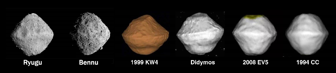 小天体是从太阳系形成之初就存在的“剩余材料”,记录了太阳系早期的状态信息,可以为探寻行星的演化乃至生命的起源提供重要线索。小天体形貌的演化过程存在丰富的动力学现象,近十年天文观测、深空任务的新发现,使得“陀螺型”的小行星在行星科学的研究领域备受关注。这类小行星通常拥有鼓起的赤道脊,外表形似旋转的陀螺。如此众多的小行星都具有这样独特的形态(图1),暗示了太阳系中可能存在某一普遍机制促进了陀螺地貌的形成。过去三年时间里,日本的隼鸟二号(Hayabusa2)与美国的冥王号(OSIRIS-REx)分别对其中两颗陀螺型小天体“龙宫”和“贝努”进行了前所未有的近距离探测,为我们提供了诸多线索来揭开这一问题的神秘面纱。探测数据表明,这些小行星表面覆盖一层松散的碎屑,其上散布诸多尺寸超几十米的巨石,呈现出典型的“碎石堆“地貌。进一步的分析发现,它们除了独特的陀螺形貌外,表面散落的巨石似乎也有着普遍的规律:极地存在上百米尺寸的稳定巨石;中纬度的巨石均有一定程度倾斜,并陷入风化层若干米;而赤道区域的巨石丰度远远少于其他区域。由于这些巨石的尺寸决定了其与小天体本身的形成时间相当,在太阳系的漫长演化中其与小天体共同演化,因此这些巨石构成的地质遗迹必定记录了小天体的地质演化乃至起源线索。