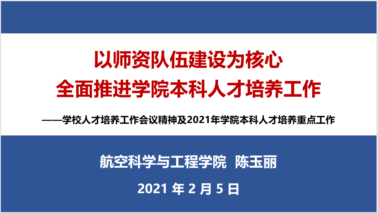 本科教学副院长陈玉丽做了题为《以师资队伍建设为核心,全面推进学院本科人才培养工作》的报告,主要回顾了学校人才培养工作会议精神,重点汇报了2021年学院本科人才培养重点工作。陈院长强调,通过“对标、传承、再塑”,构建北航高质量人才培养体系,其核心是五育并举、三全育人,全员全过程全方位培养一流人才。陈院长从专业、师资、课程、教材、质量保障等五方面对本年度人才培养重点工作做了汇报,对金沙集团官网专业和课程现状进行了梳理,提出建设高水平师资队伍、打造高质量课程和高水平教材等多项举措,指出2021年要落实课程思政全覆盖、一流本科课程建设、毕设质量管理、新版培养方案修订等重点工作。
