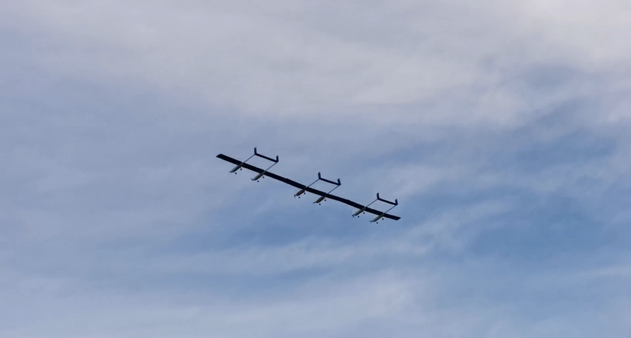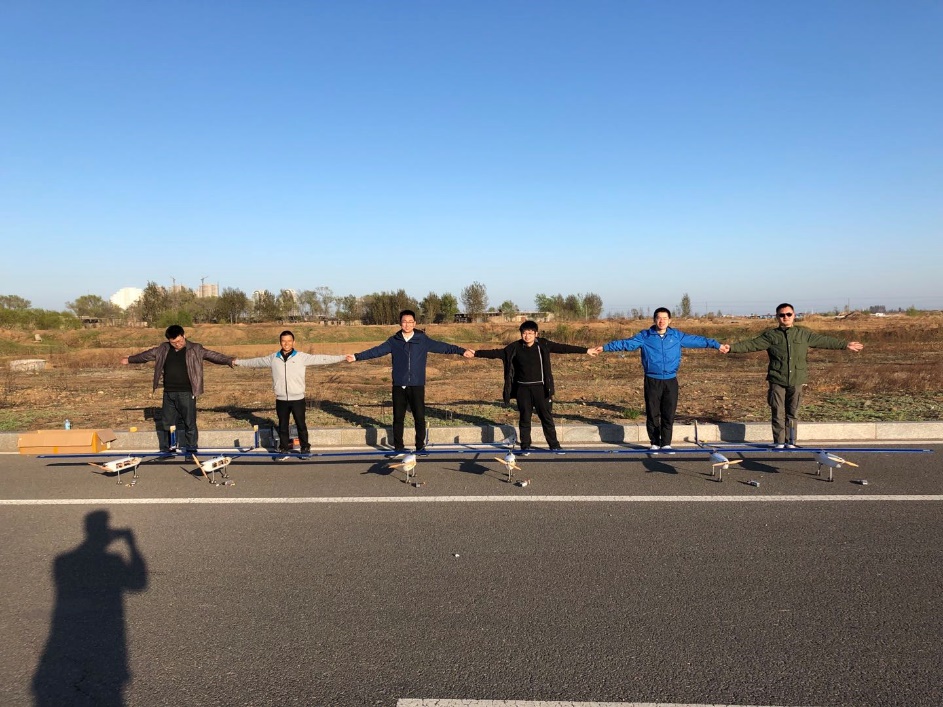 研究团队提出了这种新概念飞行器飞行新原理,通过安装在翼尖的铰接机构,将3米翼展的单机并联成多机翼尖铰接组合式飞行器,将获得比单机更高的升阻比。但由于存在相对滚转自由度,组合飞行器存在这个方向的不稳定,严重影响空中稳定飞行。研究团队通过大量理论分析、方案设计和地面试验,分别于2018年12月和2019年4月,成功实现双机和三机地面预铰接首飞;通过设计增稳控制方案,保障了铰接组合飞行器的稳定飞行,并具有较好的操控性和机动性。