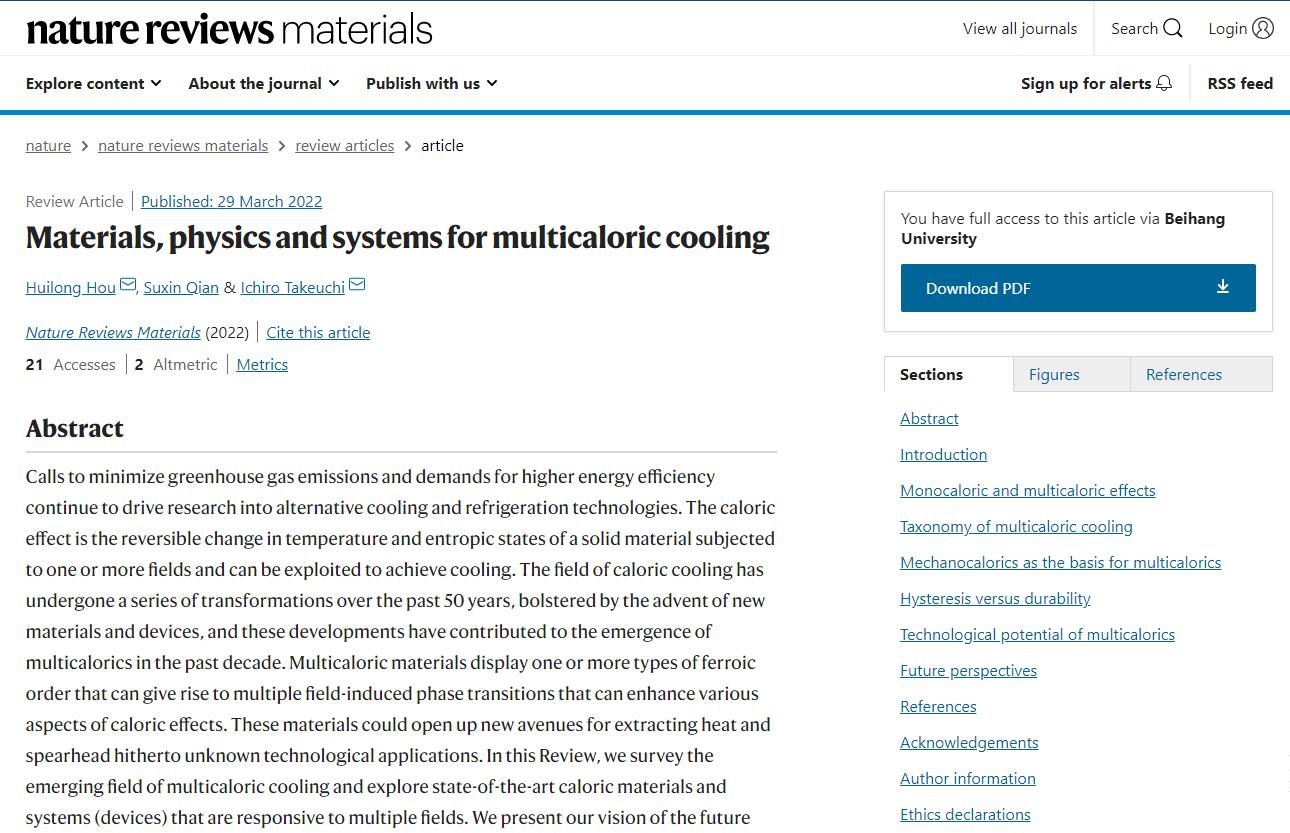 北航新闻网3月31日电(通讯员 乔梁)2022年3月29日,《Nature Reviews Materials》期刊报道了金沙集团1862cc侯慧龙副教授在固态相变制冷领域取得的新进展:《Materials, physics and systems for multicaloric cooling》(https://www.nature.com/articles/s41578-022-00428-x)。固态相变制冷技术,基于固体材料内禀序参量在外场源下的可逆改变引起材料的吸/放热效应,经热力学循环实现制冷,具有绿色环保、节能高效、低噪稳定等诸多优点,不仅具有巨大的市场经济价值与社会环保意义,而且在航空航天、空间探测等领域也具有重要应用前景。此工作在梳理和归纳了单场以及多场转换与调控固态相变制冷技术的基础上,从材料、物理、系统三个层次进行了原创性的研究工作,实现了场致熵变的联合增效,建立了相变制冷材料的延寿准则,完善了多场功-能转换器件的评价体系。该工作不仅是对单场致效应的归纳与补充,而且丰富和拓宽了多场作用下制冷材料与器件的种类及概念范畴。值得一提的是,所发表期刊《Nature Reviews Materials》的影响因子(IF=66.308),在全球物质类(材料、化学、物理、工程、机械等)研究期刊中,排名第一。该项工作也是北航自建校以来发表在该期刊上的第二篇成果(第一篇由江雷院士于2017年发表)。