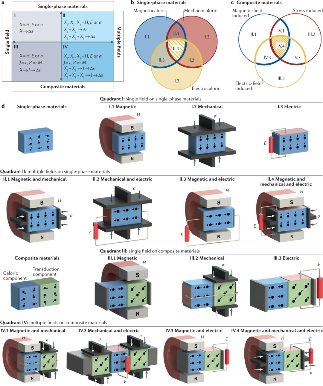 图1. 固态相变制冷多场响应材料与器件设计。根据材料类型(单相材料或复合相材料)以及外场个数(单个或多个),(a)可归类固态相变制冷类型。针对(b)单相材料和(c)复合相材料的磁热、电热和力热效应,细分单场致效应和多场致效应之间的关系。(d)多场响应材料与器件的分类设计。