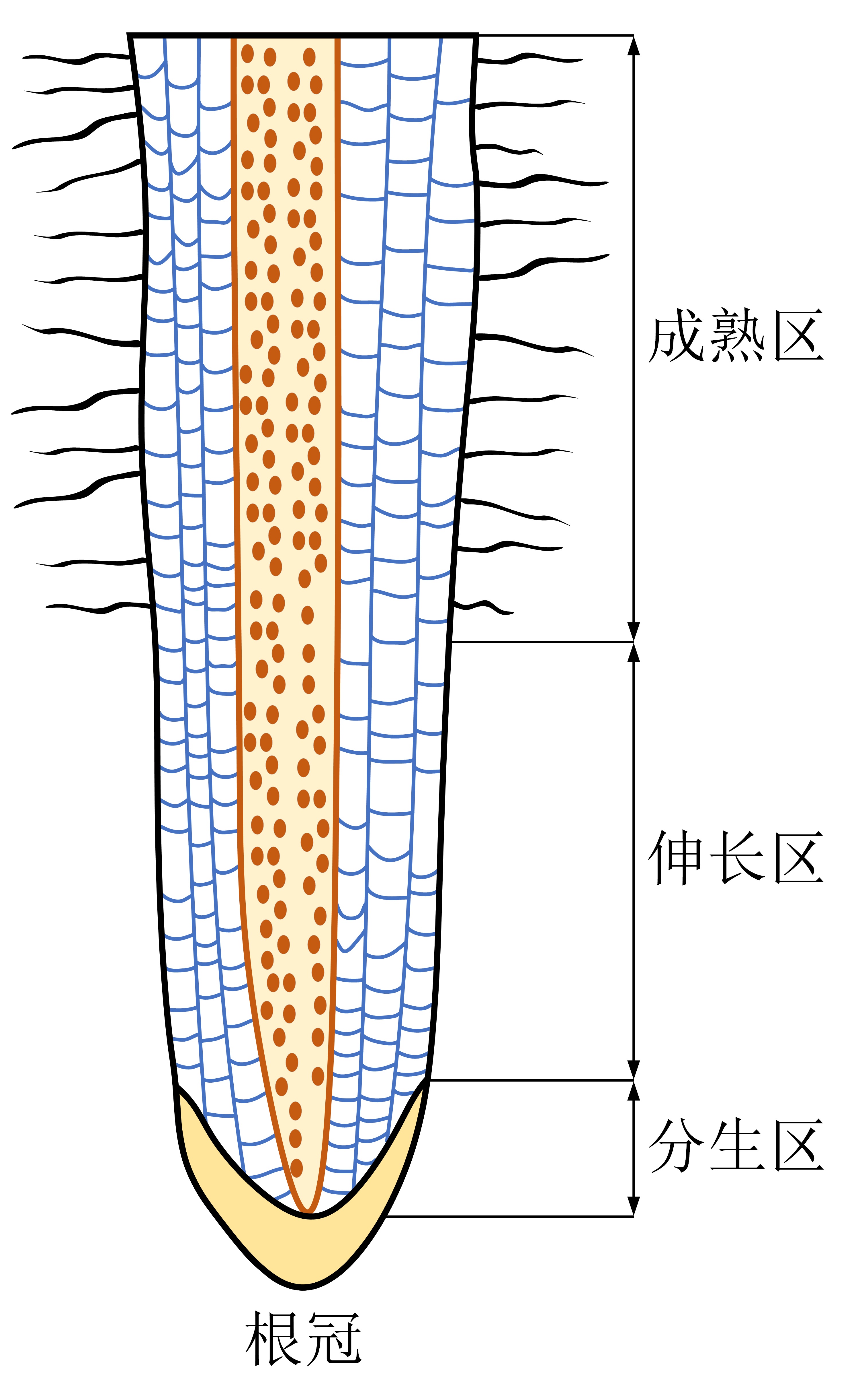 如图1所示,根尖一般由根冠、分生区、伸长区和成熟区等四个部分组成。根冠能感受重力的梯度。分生区的细胞在分裂后朝着根冠的方向被拉长。成熟区的分化过程受根的粗细、含水量、荷尔蒙含量以及基因等因素影响。如图2所示,这项工作主要考察了直根和须根两种根系。直根系由一个主根和许多侧根组成;主根长且粗,有很强的向地性;侧根较短,相互分离。须根系没有明显的主根;大量的不定根从茎等非根组织萌发、生长,它们的长度、粗细大体相同。