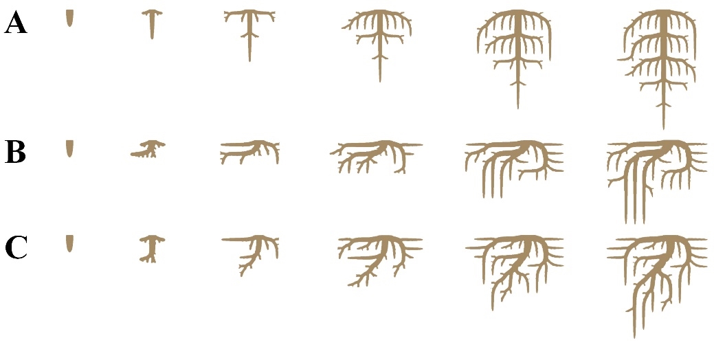 图3.不同直根系的生长演化:(A)向地性较强;(B)向水性较强;(C)向地性和向水性相当