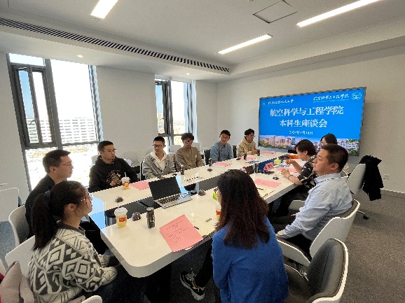 与会本科学生代表先后发言,同学们结合自己在航空学院学习生活科研的实际,分享了自己进入学院以来的感受与体会,表达了对学院以生为本、关心帮助的感谢,并围绕专业课程设置、本科班级建设、科创实践支持、后进同学学业辅导等方面提出意见建议。鲍蕊书记结合学校、学院政策逐一进行了耐心细致的解答。