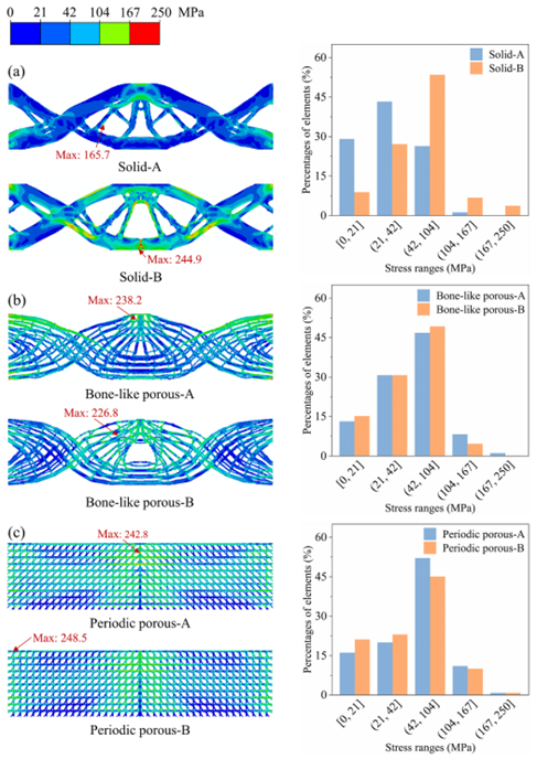 如图5所示,在不同冲击载荷作用下设计出实心结构、类骨多孔结构和周期性多孔结构。研究表明,在不同冲击载荷作用下,类骨多孔结构的应力变化与实心结构相比差别不大。这表明它们具有优异的力学稳健性,可适用于复杂的载荷场景。虽然多孔结构与实心结构在能量吸收方面不分伯仲,但前者具有更好的力学稳健性,可以帮助生物抵抗自然界中复杂多变的冲击载荷。