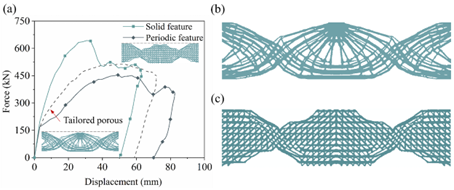 图4 (a)不同结构的力—位移曲线,(b)考虑了实心特征的多孔结构,(c)考虑了周期特征的多孔结构。