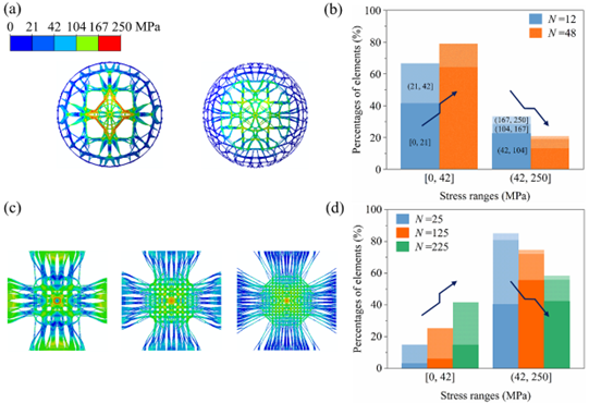 图6 (a)不同子域划分下的半球壳多孔结构应力分布,(b)半球壳应力分布柱状图,(c)不同子域划分下的方形板结构应力分布,(d)方形板应力分布柱状图。