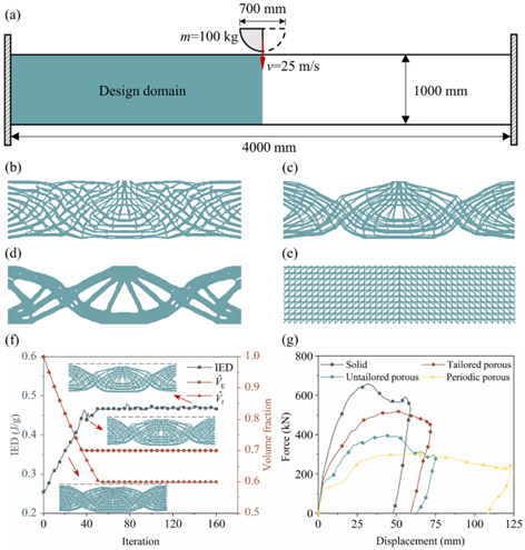 图3 两端固支的二维梁结构受到冲击载荷时的耐撞性优化。(a)载荷与边界条件,(b)未裁剪的多孔结构,(c)裁剪后的多孔结构,(d)实心结构,(e)周期性多孔结构,(f)应变能密度和体积分数的演化曲线,(g)不同结构的力—位移曲线。