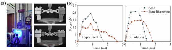 图2 实心与多孔结构的冲击试验。(a)试验装置,(b)试验和有限元计算得到的力—时间曲线。