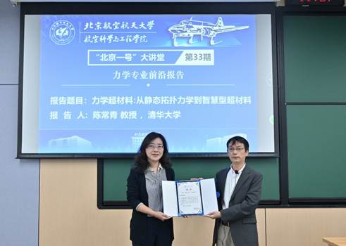 (通讯员:刘雁韦)2025年9月17日上午,金沙集团1862cc“北京一号”大讲堂第33期在沙河校区SH2-104教室成功举办。清华大学陈常青教授受邀作了题为“力学超材料:从静态拓扑力学到智慧型超材料”的学术报告。陈常青教授目前任清华大学工程力学系主任、钱学森力学班执行首席教授,是国家级高层次人才计划入选者,项目首席科学家。近200名师生齐聚一堂,共享了这场前沿学术的思想盛宴。本次大讲堂由航空学院副院长邵丽华教授主持。