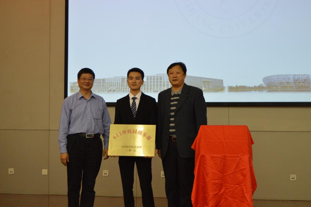 接着,中航工业成都飞机设计研究所蒋平部长和北航金沙集团1862cc院长杨超教授共同为北航-611所校园俱乐部揭牌,这标志着俱乐部的正式成立。随后蒋平部长和杨超院长共同向北航-611所校园俱乐部第一届会长张璞川同学授牌,并合影留念。