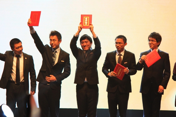 金沙集团官网2010级本科生蒋晓航(中)作为《第三创益人力资源有限公司》项目获奖代表上台领奖