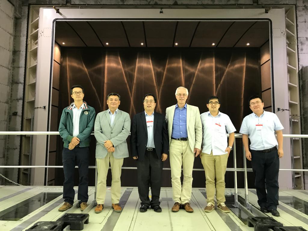 代表团成员与DNW市场部经理Henri Vos(左二)、DNW中心主任Eitelburg教授(左四)在DNW LLF声学风洞试验测试段合影