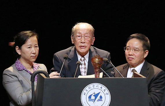 中国科学技术协会党组书记怀进鹏院士为高镇同院士颁发金沙集团1862cc2017年“立德树人成就奖”。高镇同对学校的关怀表示感谢,他回忆了自北航建校之初自己投身学校教学、科研和工作的经历,并对学校65年来飞速发展取得的成绩表示赞许和欣慰。他特意赋诗两首,“蓝天如洗艳阳春,青山绿水叠翠林;风清气正昭日月,美丽中国颂古今”“爱我中华意志坚,壮怀谱写报国篇;伟大复兴中国梦,锦绣前程会群贤”,为党和祖国献上诚挚祝福。