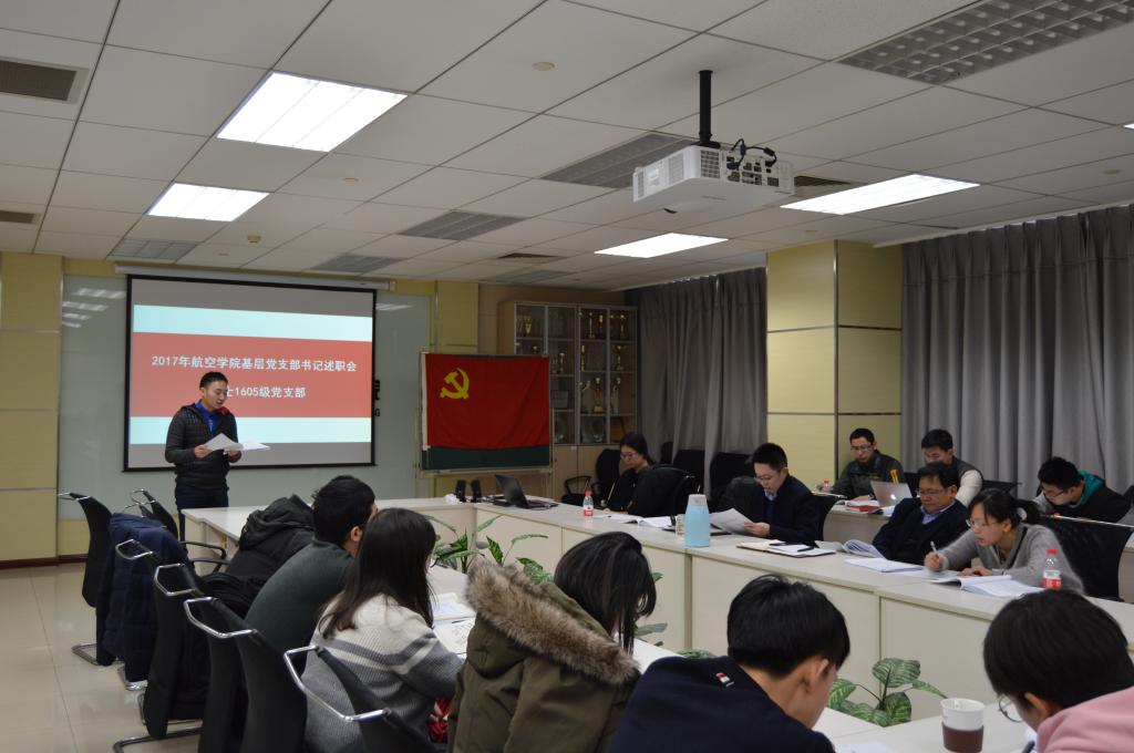 为深入学习贯彻习近平新时代中国特色社会主义思想和党的十九大精神,进一步推动全面从严治党向基层延伸,提升学生党支部组织力,充分发挥支部战斗堡垒作用,金沙集团1862cc于2018年1月13日在新主楼C708召开2017年度“不忘初心 牢记使命”学生党支部书记党建工作论坛暨抓支部工作述职评议会。航空学院党委书记林贵平老师、行政副院长蒋崇文老师、党委副书记梁颖华老师、分团委书记钟国老师,学院本科及研究生工作办公室辅导员以及全体学生党支部书记参加了本次述职评议会。
