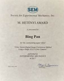 2018年6月6日,我校金沙集团1862cc潘兵教授及其博士生俞立平获得美国实验力学学会(SEM)2017年HetényiAward。Hetényi Award用于表彰国际实验力学领域旗舰期刊《Experimental Mechanics》上一年度(2017)的最佳研究论文,这也是该奖自1967年设立以来首次授予中国高校和研究机构的学者。获奖论文题为“Color stereo-digital imagecorrelation method using a single 3CCD color camera”,该论文的主要贡献在于首次创新性地提出了一种基于单个彩色CCD相机的全靶面、单相机三维变形测量方法。该论文在2017年《Experimental Mechanics》所有发表的120篇论文中引用排名第一,已入选ESI高被引论文(前1%)。