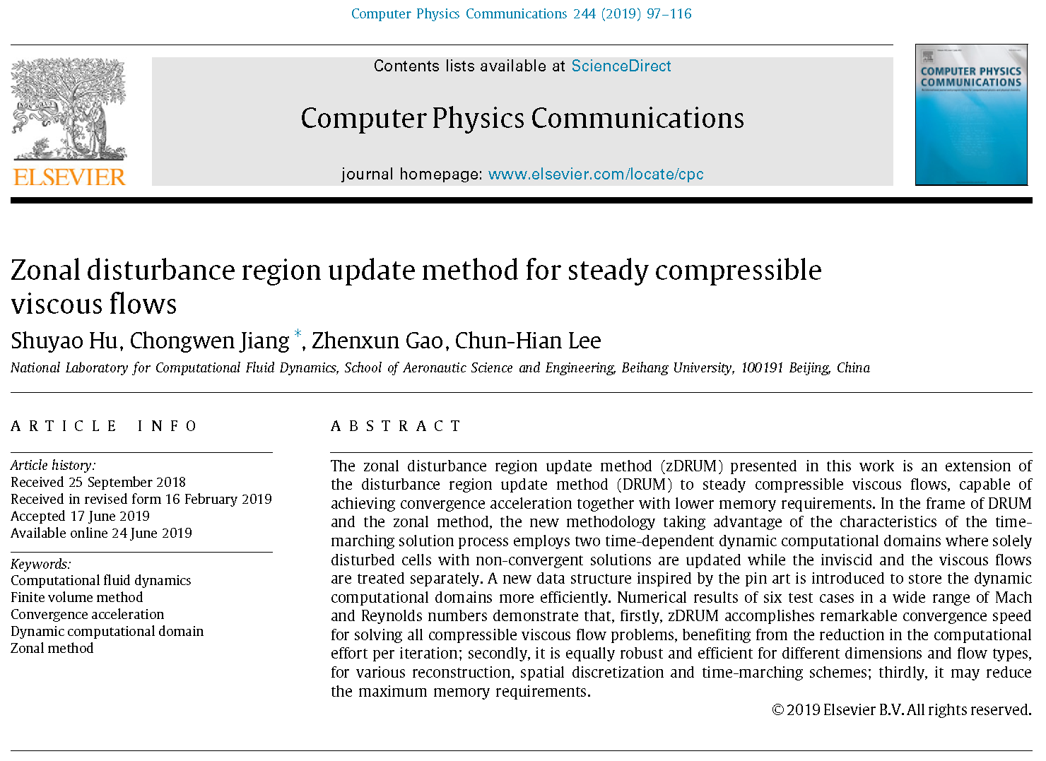 近日,金沙集团官网李椿萱院士团队博士生胡姝瑶在蒋崇文副教授、高振勋副教授指导下在物理数学领域国际顶级期刊《Computer PhysicsCommunications》上发表题为《Zonal disturbanceregion update method for steady compressible viscous flows》的学术论文,这是该团队在扰动域更新法研究方向的又一篇学术论文。去年,该团队提出了扰动域更新法并发表了北航在该期刊的第一篇力学论文。