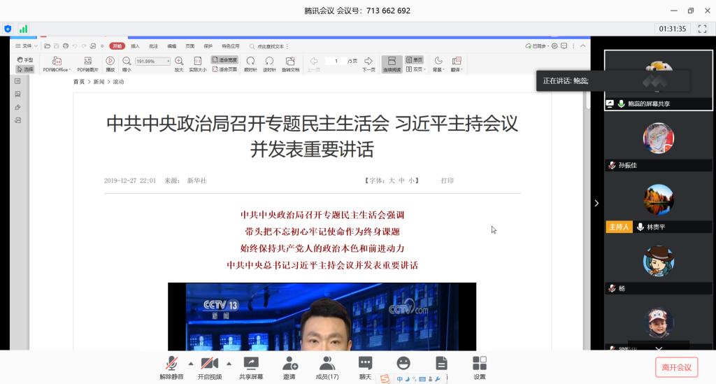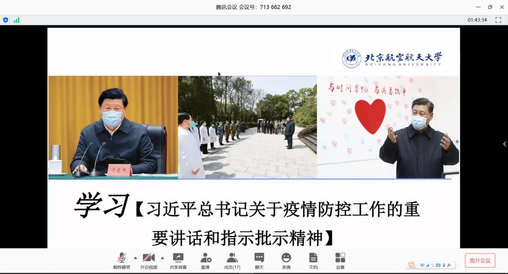 (通讯员 孙振佳)4月17日上午,金沙集团1862cc党委理论中心组以视频会议的形式,围绕习近平总书记在“不忘初心、牢记使命”专题民主生活会上的重要讲话精神和习近平总书记关于疫情防控工作的重要讲话和指示批示精神进行专题学习,航空学院党委书记林贵平主持会议,学院非党委委员班子成员和教职工党支部书记列席会议。