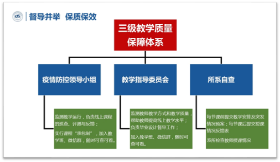 为了更好地保障教学工作,航空学院积极开展教学监督和指导工作,建立三级教学督导保障体系,从学院、教指委、系所三个层面保证教学工作在有序开展的前提下保质保效。监督方面,学院成立了疫情领导小组,采用“承包制”模式开展网上教学的巡查工作,监测教学运行情况;指导方面,学院教学指导委员会委员进入每门课程的线上课堂,跟听课程并在课后对教师进行指导,提升教学质量;此外,系所在课前及课后对教师的课程安排及授课情况进行把关,确保每门课程的质量和效果。