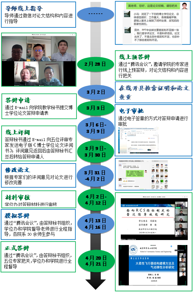 严格把关不放松,流程不减云申请。为保证博士学位论文的质量,在学生提出答辩申请前,首先由各自课题组通过腾讯会议平台组织线上预答辩,邀请领域内专家对论文结构和研究内容进行指导与把关。在专家把关通过后,由学生向图书馆在线提交开具学术论文检索证明和学位论文查重检测申请,再向学院教学秘书提交博士学位论文答辩申请。学位分委会审批通过后,由答辩秘书通过E-mail向评审专家发送电子版《博士学位论文评阅书》,评阅意见返回后由答辩秘书汇总后转给答辩申请人。申请人根据评阅意见对论文进行修改完善,之后再由导师和学位评定分委会审核。审核通过后,由学院教学秘书将答辩审批材料提交校研究生院学位办进行审批。审批通过后,学位办和学院安排督导老师对线上答辩流程进行指导。为进一步保证答辩质量和效果,4月13日和4月16日,由答辩秘书、学院相关负责人和研究生院学位办工作人员共同参与,对两人的学位答辩进行了全流程预演,发现和排除可能存在的问题与不足。