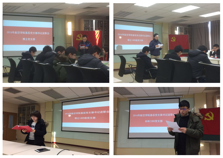 紧接着,航空学院本科党支部、博士研究生党支部以及14级、15级和16级硕士研究生党支部书记分别对2016年度支部党建工作履职主要情况和特点、存在的主要问题及原因、下一步的工作思路和主要措施等方面进行了工作述职,并就党建工作中的闪光点、困难点等进行了深入交流与讨论。大家充分肯定了2016年度各学生党支部在党建工作方面所取得的成绩,同时也清醒地意识到在党建工作中仍然存在许多困难和不足,在以后的工作中需要继续克服困难、弥补不足,保证党支部向着更好的方向发展。