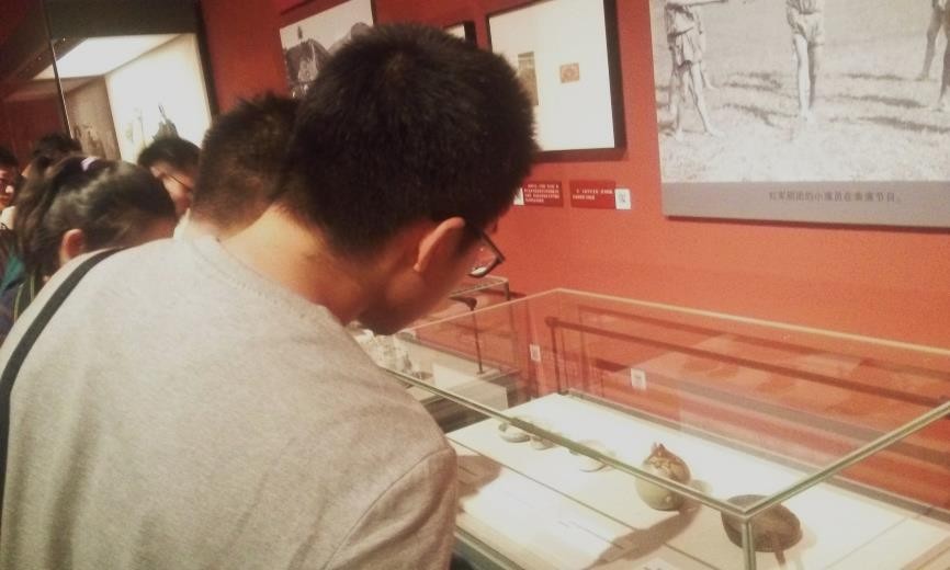 党员同学们先后参观了红军长征胜利八十周年文物展和复兴之路展厅。在红军长征胜利八十周年文物展厅中,大家看到了很多历史文物,有当年的各种旗帜、军械及生活用品,以及长征路上的各种文书与战利品等。当看到画有红军爬雪山、过草地的一幅幅艺术作品的时候,大家不禁感叹长征过程的艰难与前辈们信仰的坚定,感悟到长征精神的历史意义及其重要性。