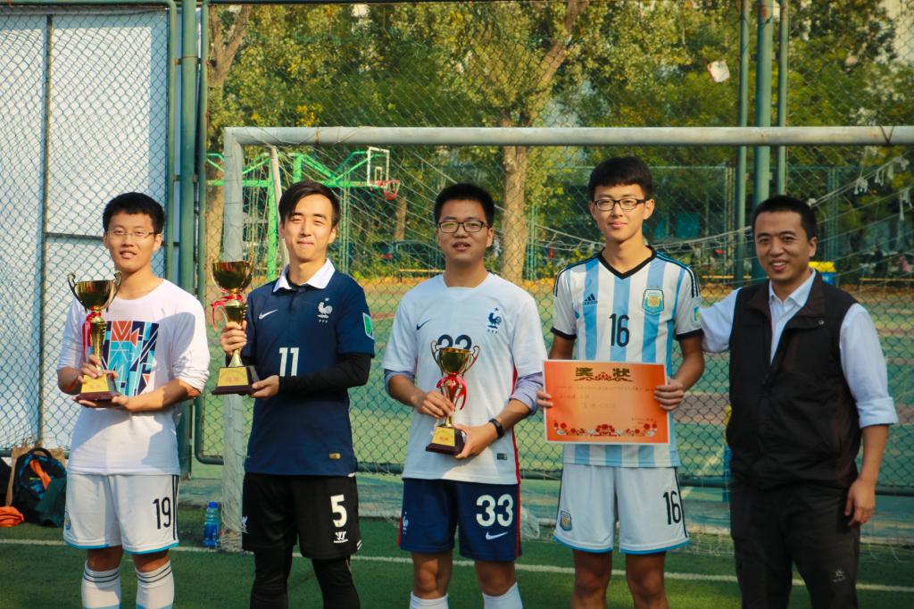 23日中午14点,本次研究生足球赛的颁奖典礼在学校校足球场举行,金沙集团1862cc研究生指导主任蒋崇文老师亲临现场为本次比赛获得冠、亚、季军以及道德风尚奖的班级颁奖,并为各位获奖同学颁发奖品。