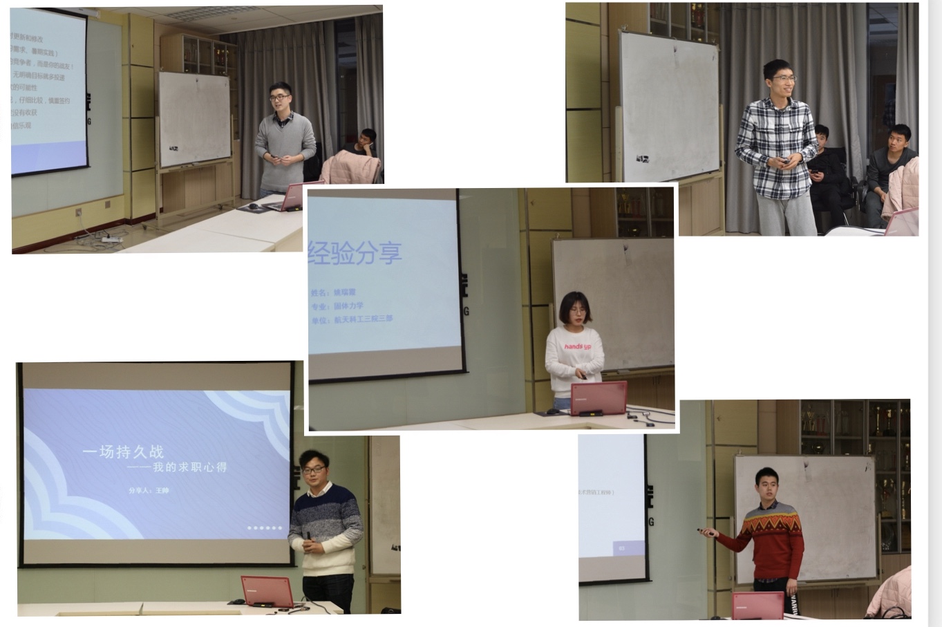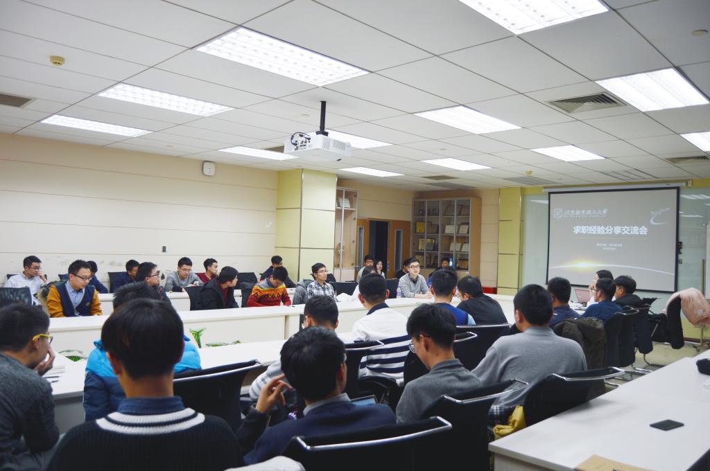 五位师兄师姐分别结合自己的求职经历和经验体会为大家展开分享。孙亦璋师兄分享了他在航天一院面试的经历及求职的心路历程,重点对就业规划要考虑的因素和简历制作需要注意的问题做出了具体详细的介绍;孔垂欢师兄讲述了自己求职准备和简历投递,并根据自身特点和发展规划在多份offer做出权衡,选择自己最心仪的职位;姚瑞霞师姐重点谈及各类面试的应对方法和注意事项,并强调了研二暑期实习的重要性,以及体育、文艺等特长是加分项;王帅师兄求职门类众多,包括航天科工、中航工业、中船重工、中电、中国航发及电信互联网行业如腾讯、华为等,求职经验丰富,扩宽了大家的就业视野,给了我们很好的启发;贺宇师兄作为金沙集团官网理工科学生向银行、金融类方向求职的典型代表,讲述了自己为跨行业求职做的辅修学位、实习及其他一些必要的准备,对有意跨行业发展的同学是不错的指导和鼓舞。
