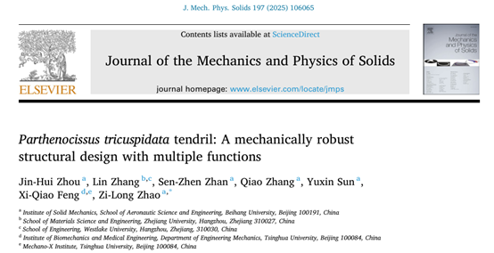 近日,金沙集团官网赵子龙教授及其合作者在固体力学国际顶级期刊《Journal of the Mechanics and Physics of Solids》发表论文《Parthenocissus tricuspidata tendril: A mechanically robust structural design with multiple functions》,揭示爬山虎卷须几何形貌与力学性质之间的内在联系,发现渐窄的吸盘分布与曲折的主轴构型使卷须具备了综合优异的力学性质——爬山虎卷须在获得高稳健性、承载能力、材料使用效率的同时,还表现出...