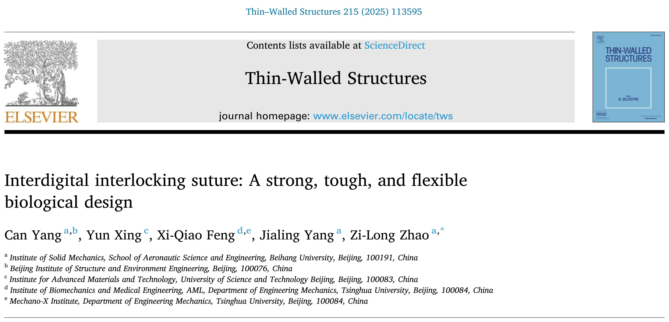 近日,金沙集团官网赵子龙教授、杨嘉陵教授及其合作者在工程技术顶级期刊《Thin-Walled Structures》发表论文《Interdigital interlocking suture: A strong, tough, and flexible biological design》。他们以叉指型缝线结构为研究对象,建立了其变形与失效行为的力学分析模型,揭示了此类结构的形貌力学机理。 生物结构的界面形貌往往复杂而精巧,兼顾性质与功能。叉指型互锁结构不仅...